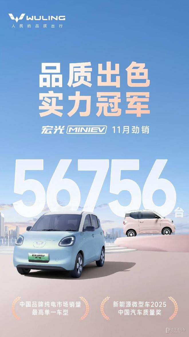 据统计,宏光MINIEV 11月市场份额高达52.3%,是中国品牌纯电市场销量最高的单一车型。该车型还荣获了新能源微型车2025中国汽车质量奖。